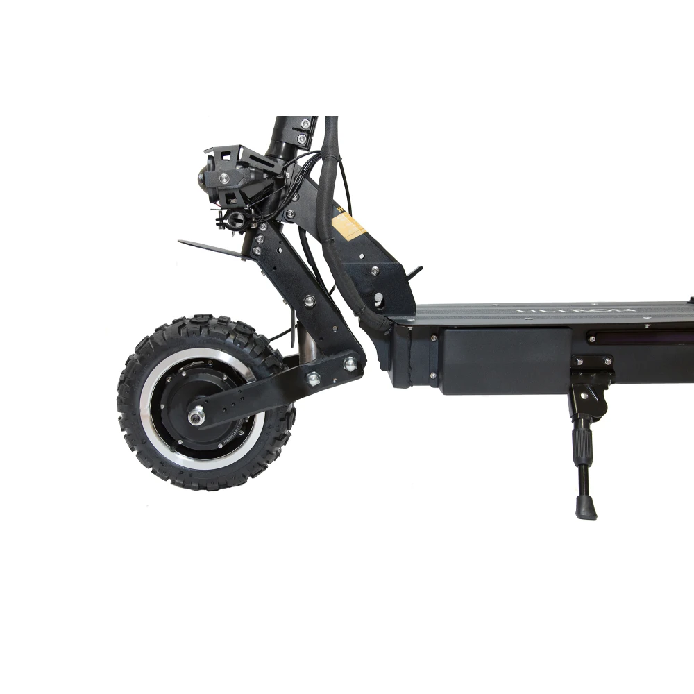 Колесная часть представлена 11-дюймовым диаметром с агрессивным протектором, обеспечивающим отличную сцепляемость с грунтом и асфальтовым покрытием. Амортизационная система размещена на заднем и переднем колесе – гарантирует плавность хода. Контроль за полноприводной моделью, скоростными характеристиками и зарядом АКБ осуществляется с помощью жк-дисплея.