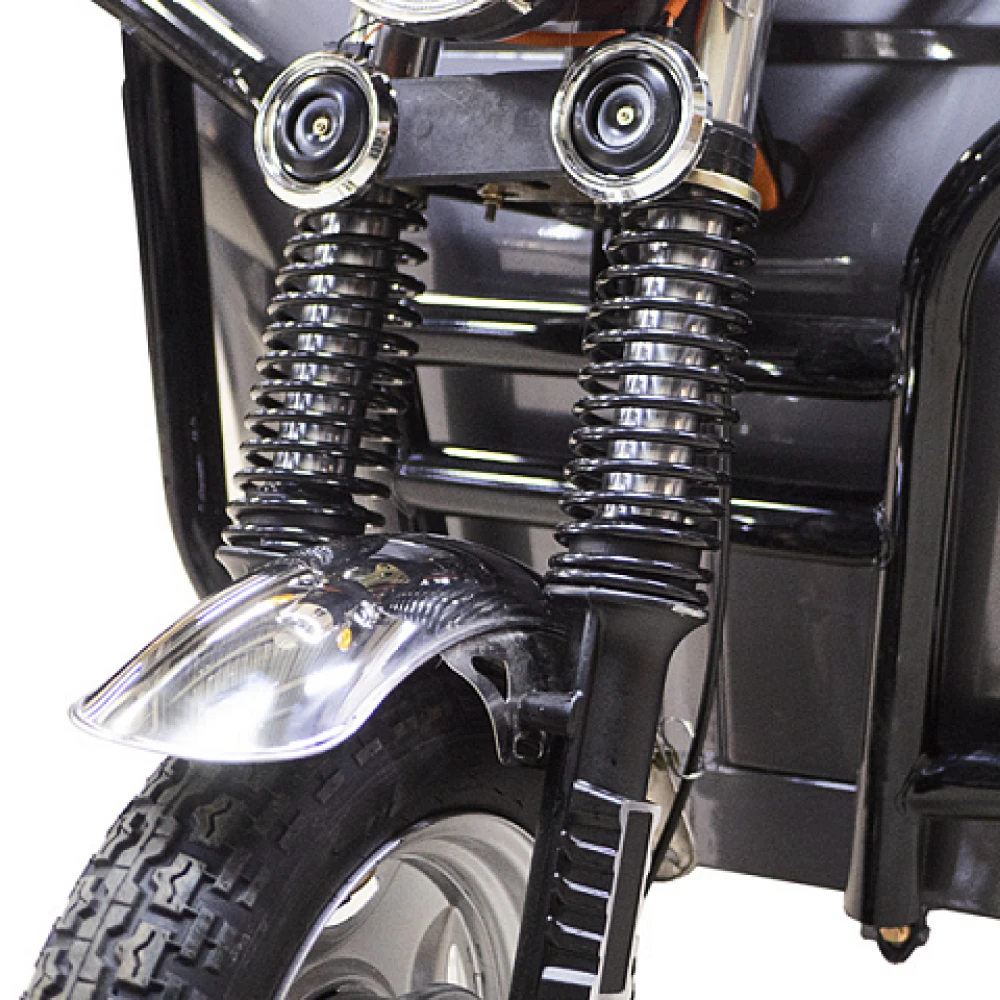 Грузовой электротрицикл Rutrike D4 NEXT II 60V1500W синий – мощная техника в презентабельном дизайне моментально привлекает внимание представителей бизнеса и фермеров. Объемный багажник, вместительное виденье, лучшие параметры удобства и комфорта заставляют внимательнее присмотреться к техническим характеристикам. Наш интернет-магазин предлагает купить электротрицикл по разумной стоимости. Каждому покупателю гарантирована бесплатная консультация, помощь в оформлении заказа. Модель оснащена мощным движком на 1500 Вт, который в сочетании с емкой батареей (от 55А*ч) обещает максимальный разгон до 25 км/час, которого хватает на преодоление дистанции до 80 км. Производитель обращает внимание, батарея не входит в комплектацию. Купить АКБ, подобрать максимально совместимую можно благодаря нашему интернет-магазину. Из других преимуществ производитель выделяет максимальную оснащенность функционалом. Техника оборудована зеркалами заднего вида, гидравлической амортизационной подвеской, информационным дисплеем. Имеется дополнительное место для пассажира. Широкая платформа для ног в сочетании с сиденьем исключает дискомфорт и проблемы с позвоночником. Широкие колеса (переднее х заднее - 3,50-R12 х 4,00-R12) отлично сцепляются с грунтом. Вместительный кузов размерами 3270 x 1200 x 1450 ДхШхВ – настоящая находка для предприимчивых личностей